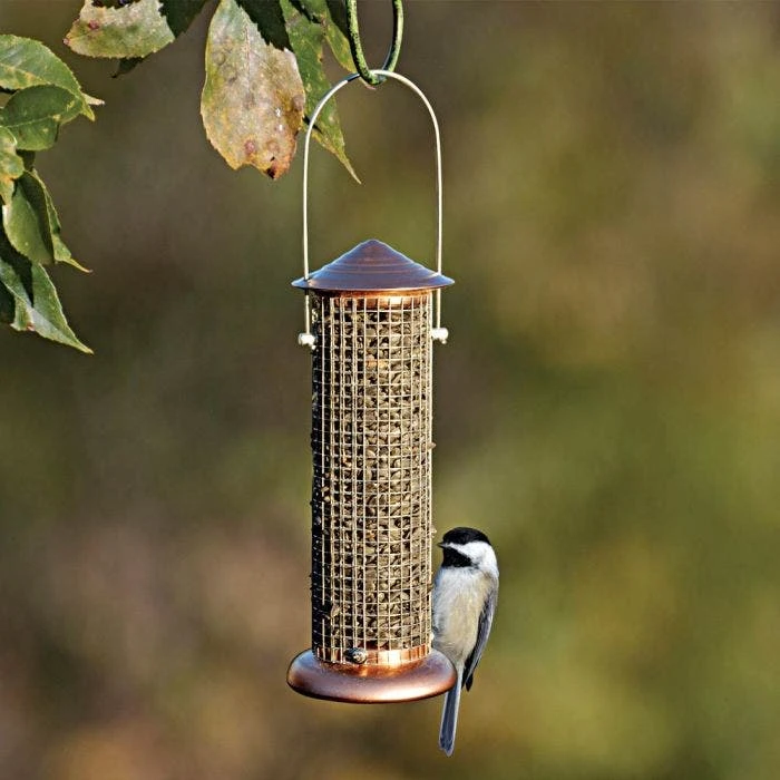Seed feeder with bronze toned base and cap holds up to 1/2- lb. pound of sunflower seeds, safflower seed, peanuts or cracked corn. The 1/4-in spacing of the steel mesh provides a sturdy structure and offers plenty of room for smaller birds to cling and dine. It is easy to fill and clean this feeder by sliding the metal roof up the included hanger . Feeder attracts cardinals, flickers, goldfinches, grosbeaks, jays, juncos, nuthatches, redpolls, sparrows, starlings, titmice and wrens.