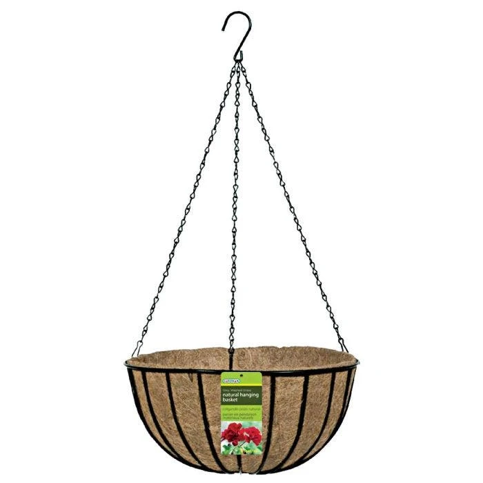 Gardman traditional black metal banded hanging basket complete with coco liner. Economically priced with a classic design. Heavy gauge wire with plastic coating for long life. Comes with a pre-formed coco liner and attached hanging chains and hook.