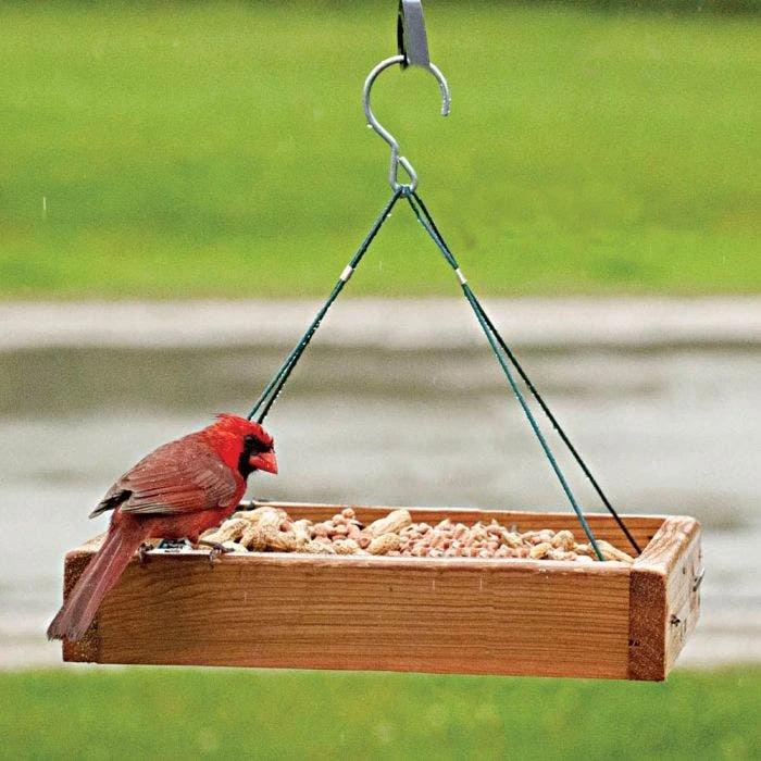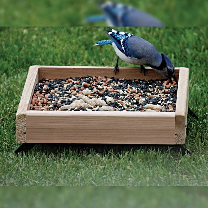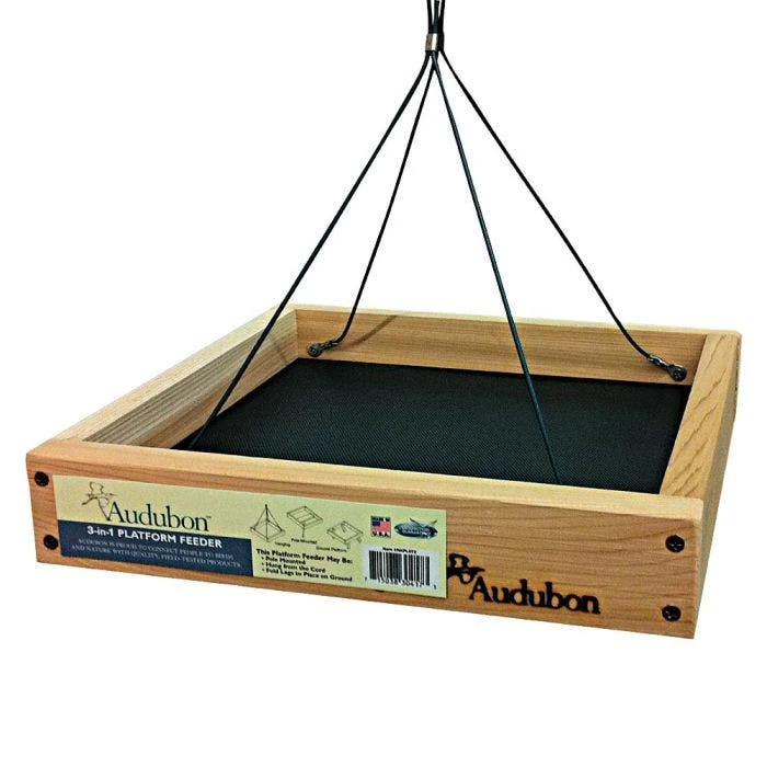 Audubon 3 in 1 platform feeder. Handcrafted from durable cedar that will add rustic elegance to your birding haven for years to come. May be hung, pole mounted, or stood on collapsible legs; holds 3 pounds of food. Attracts blackbirds, bluebirds, cardinals, crows, doves, flickers, goldfinches, grackles, jays, juncos, kinglets, mockingbirds and many others. Dispense cracked corn, fruit, mealworms, peanut chunks, peanuts in shell, suet, sunflower kernels, and sunflower, mixed, safflower, and thistle seeds.