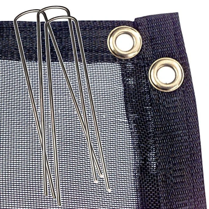Simply secure our (6311) UV treated 10′ x 10′ shade tarp down with our (2420) 24-pack anchor pins to create a 100 square foot barrier under your feeders. The shade fabric has reinforced edges and brass grommets every 2 feet giving you the just the right spacing to anchor the fabric securely. In the spring unpin, pull the fabric up clean off the debris and put away for next season.