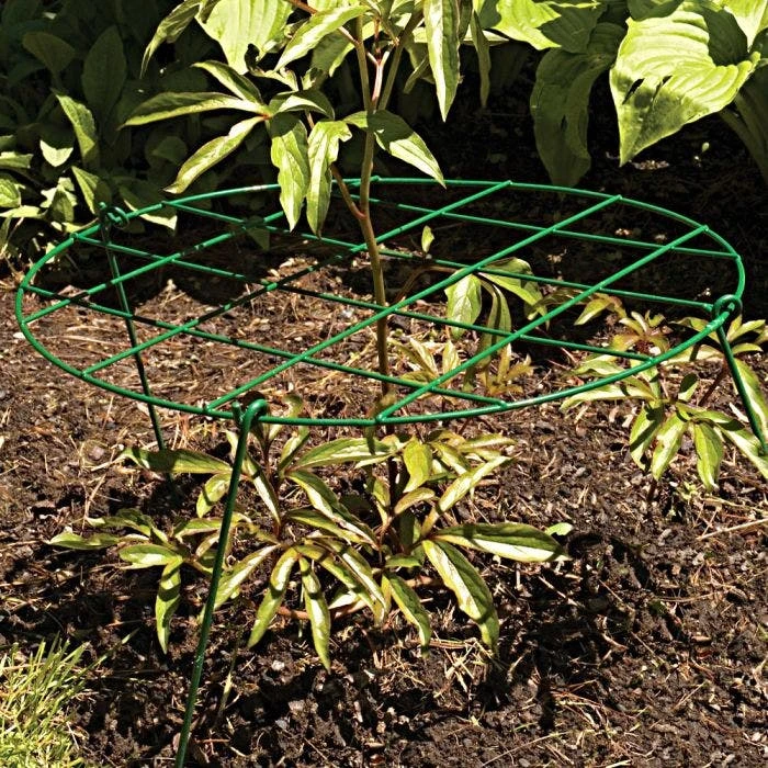 Place the grid when you plant. Plants grow through the grid for concealed support. 5 gauge steel wire, 16 inch diameter, 25 inch legs. Openings are 3 inch by 3 inch square.