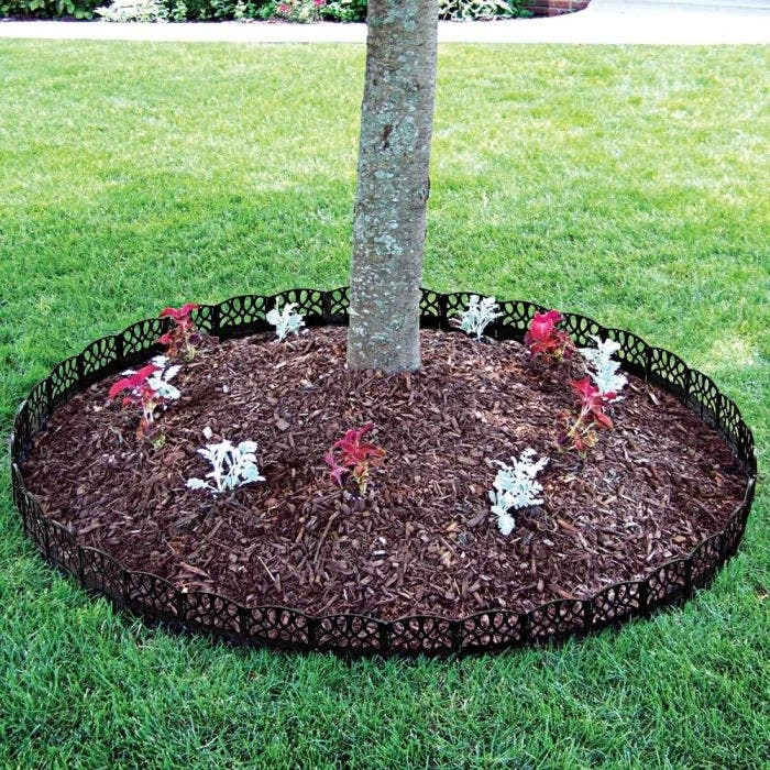 This interlocking decorative scroll landscape edging features a unique hinge connection between the pieces. It is the only interlocking edging available that can be positioned to accommodate a variety of formations including straight lines, right angles, curves, and circular designs.Use a spade to slice into the ground and create an edge. Then simply push the Edging in.