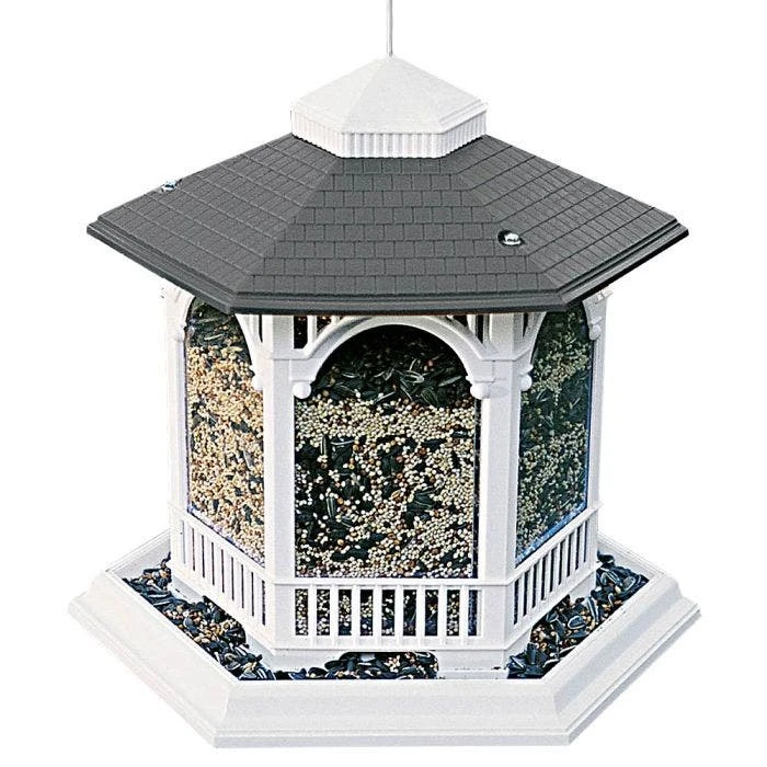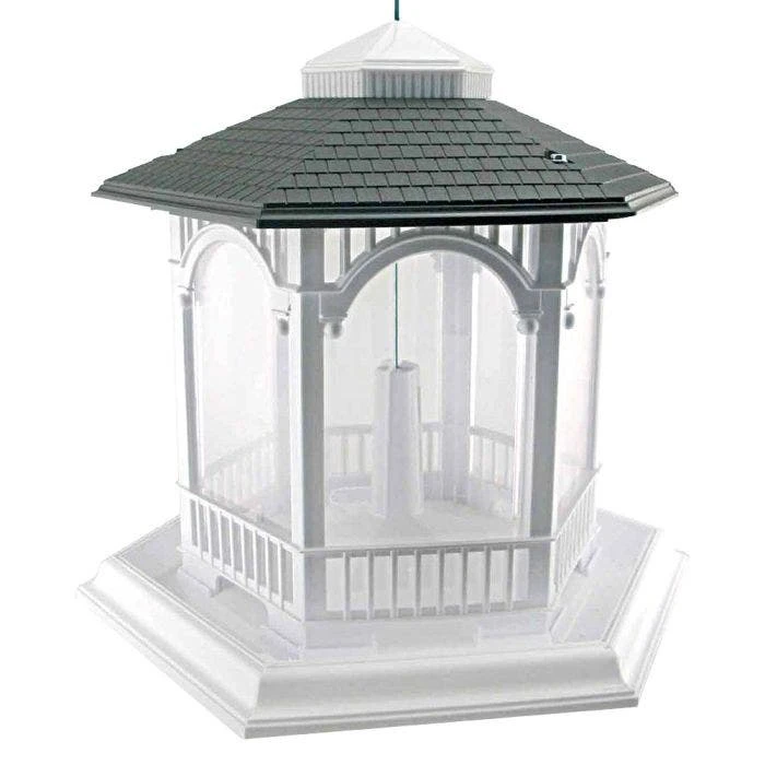 This realistic garden Gazebo attracts a wide variety of songbirds. Easy to fill lift-up top holds up to 10 lbs. of mixed seed and needs less refilling. Comes fully assembled and ready to hang. Hanging wire included. Made in USA.