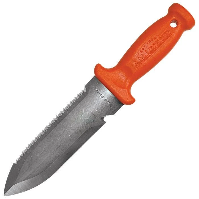 The extended dual-cut serrated edge of the Leonard Deluxe Soil Knife gives you the sharpest edge possible, making it easier to cut through tough materials.