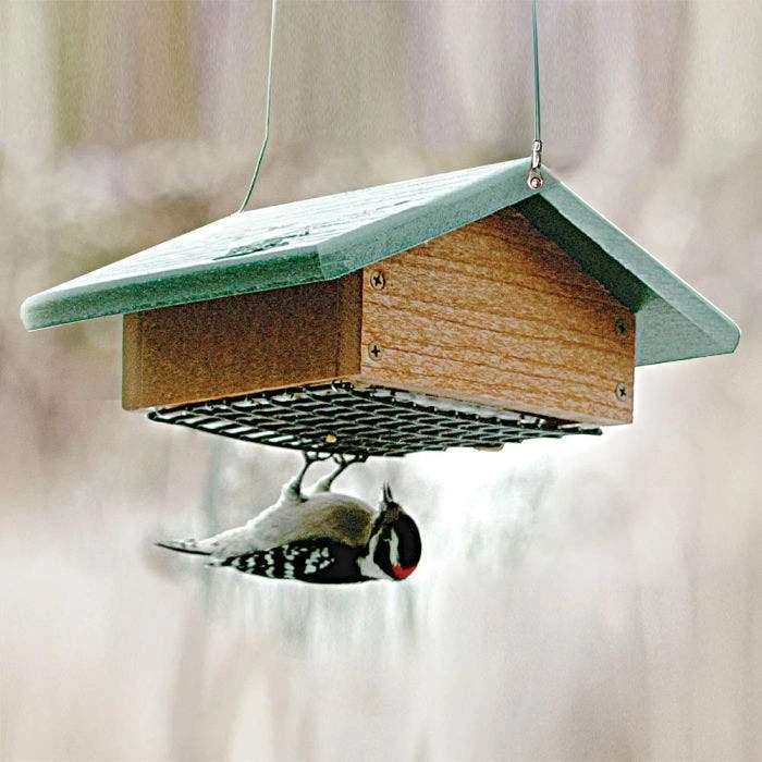 Audubon Going Green Upside Down Suet Feeder will have your birds performing acrobatics while feeding from this feeder! The green powder-coated screen allows birds to cling and traditional birds feed upside down – the way woodpeckers and other cling-feeders love to eat. Feeder is constructed of up to 90% post-consumer recycled plastic. Super easy to fill and clean. The roof protects the suet from the weather, while the recycled plastic won’t absorb water when wet and is less likely to attract mold and is easy to clean away dirt and bacteria . Fully assembled, hangs from tree branch or outdoor supports with the included cable.
