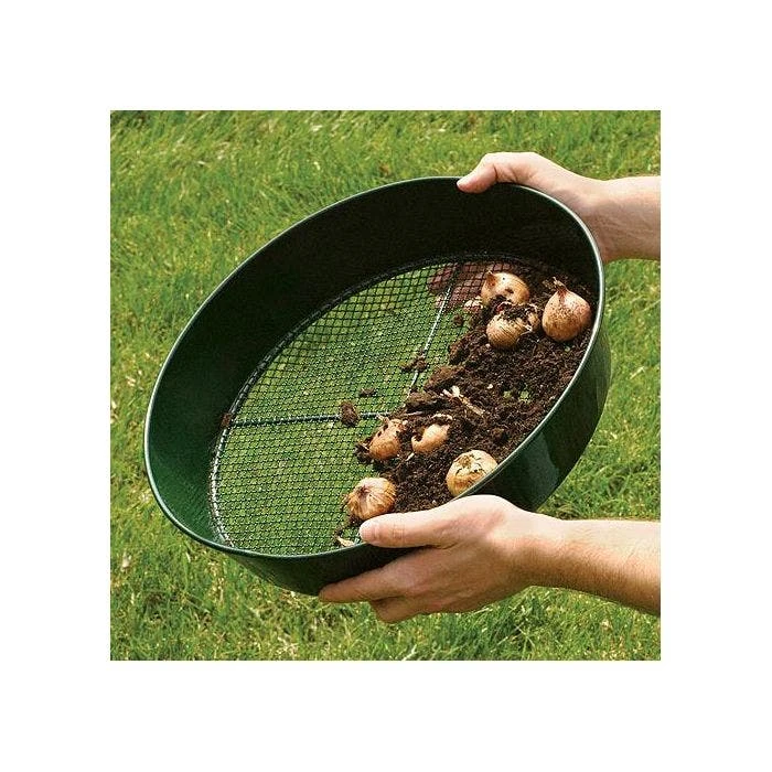 Shake your bulbs clean before storing. “Fluff” compacted soil. Screen your compost for lumps. Use when re-potting to make sure that no stones or fillers get worked into the new mix. Pan for gold in Alaska. Heavy-gauge powder-coated steel rim and screen. Measures 14-1/2-inch across by 3-inch deep, with 1/4-inch screen mesh openings.