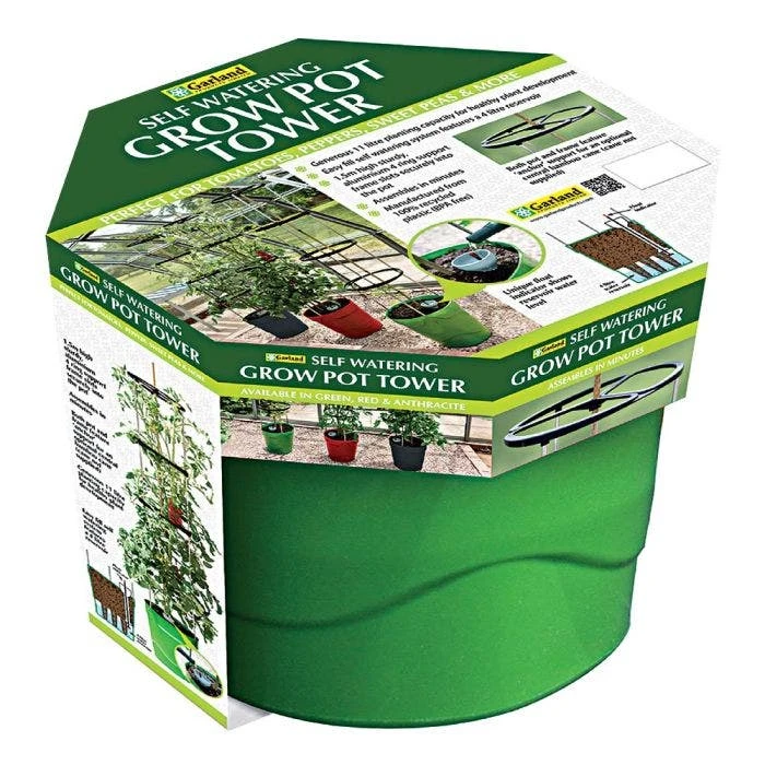 Self-Watering Grow Pot Tower works perfect for tomatoes peppers sweet peas and more. Generous 2.9 gallon planting capacity for healthy plant development. Easy fill self-watering system features a reservoir that holds over a gallon of water. Both pot and frame feature nchor’ support for an optional center bamboo cane not included. 100% recycled plastic BPA free. User guide with detail instructions included.