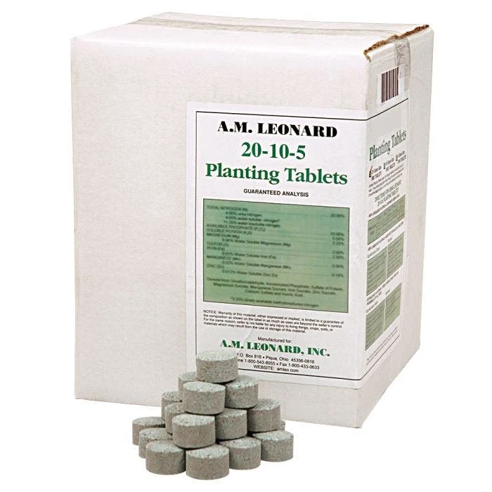 The Planting Formula 20 10 5, 2 Year Tablets are ideal for new landscape plantings, established landscapes, and containerized trees and shrubs. These tablets contain minors such as magnesium, manganese, iron, zinc, calcium, and sulfur. They also have a high nitrogen formula that is good for overall size and green leaves, making it a versatile tablet for both outdoor landscapes and containers.