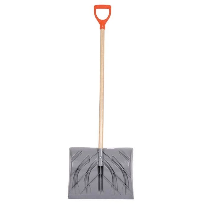 Weapons for efficient, fast snow removal! Great performance at a great price. Now blades include an additive that provides an anti-stick property, designed to minimize snow build up. This additive also offers increased abrasion resistance to further reduce blade wear. High impact poly material holds up to weather extremes and the reinforced rib design provides plenty of strength. Blade shape with raised sides creates the extra holding capacity you need for deep snow removal. Shovel handle is a large 1-1/4″ diameter, made of American Ash with a strong poly D-grip. Blade: 18″ x 13-1/2″. Overall length: 54-1/2″.
