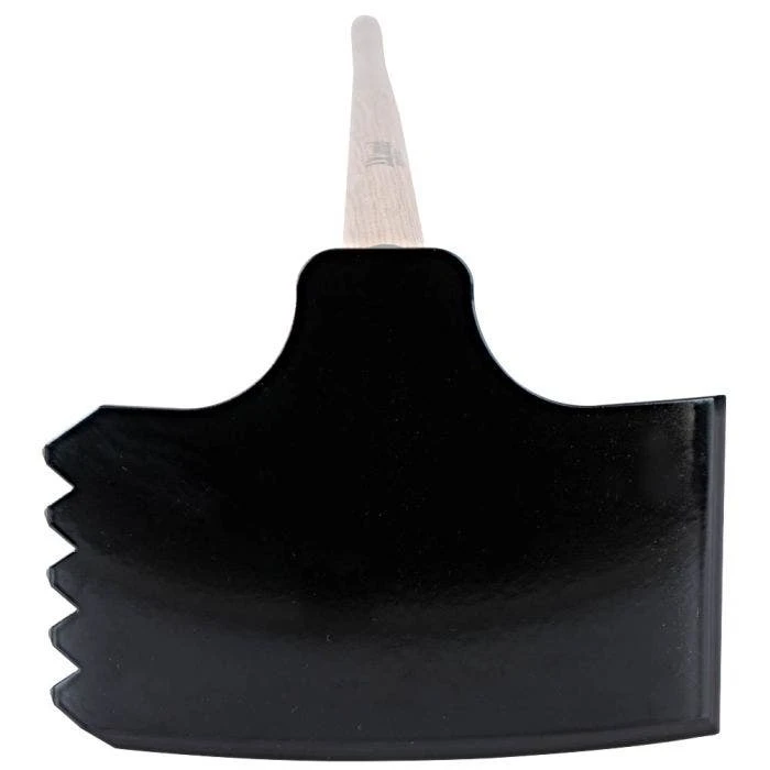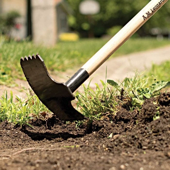The Leonard Titan Hoe is a 3 sided tool that features a straight 4 1/2 inch side blade, a 9 inch wide bottom blade, and a 3 1/2 inch toothed blade. It also has a riveted 1 1/4 inch American Ash handle.