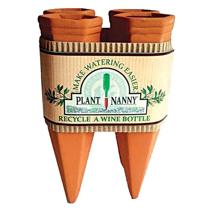 Plant Nanny Wine Bottle stakes release water slowly beneath the soil surface near the plantโs root system.