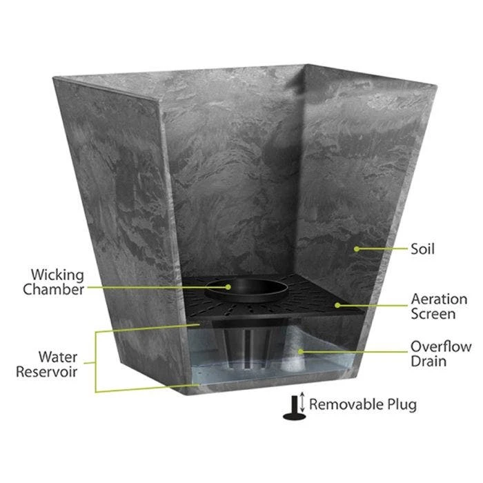 The Ella Tall Planter stands out as a striking addition to any indoor or outdoor space, seamlessly complementing sophisticated décor. Featuring a contemporary marbled design, this planter is the perfect fit for entryways, porches, patios, and decks. Made from durable Artstone, a blend of high grade stone and resin, it offers not only elegance but also UV stabilization, frost resistance, and BPA-free composition. The integrated self-watering system ensures plants receive continual hydration and proper drainage, making it easy to maintain their vibrant green and lush appearance. With its generous size, the tall square shape accommodates larger plants, shrubbery, and even dwarf trees. This beautiful, lightweight, durable planter allows you to proudly display your seasonal arrangements in style.
