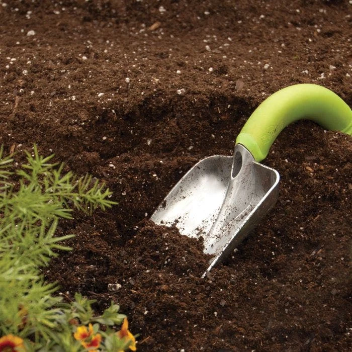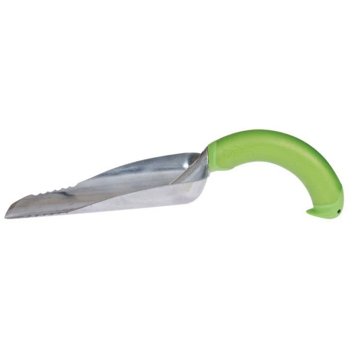 The Radius Scooper features a patented ergonomic grip that provides more leverage with less wrist stress. This extra-wide scooping trowel features a wide, sharp front blade great for shallow digging or scooping large volumes of soil from the ground or bags of potting mix. The serrated edges will cut through roots or easily open bagged material. Ideal for hand edging garden beds, digging in raised beds, and filling pots for container gardening. It’s also a great tool for the charcoal grill. 4″W x 3.75″H x 15″L.