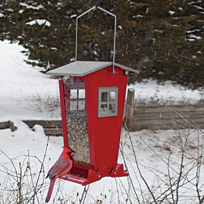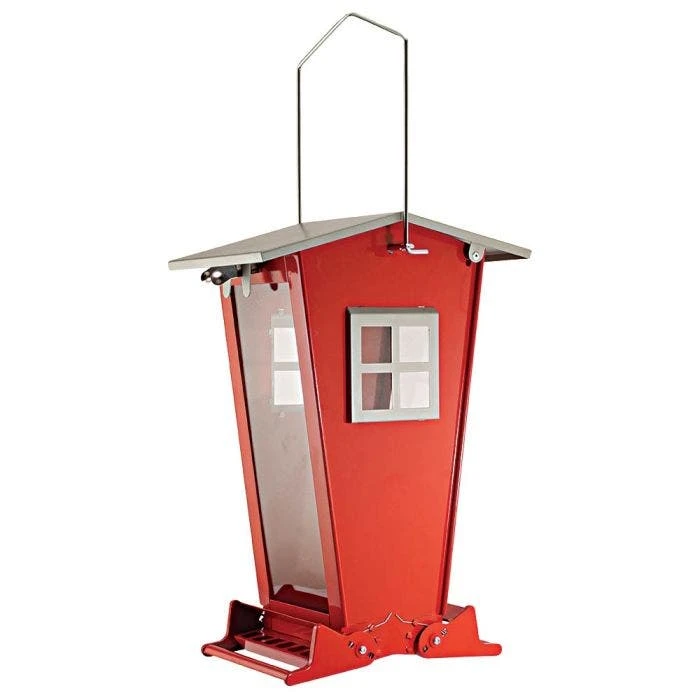 Audubon Snack-Shack Feeder is squirrel resistant with weight-activated perches to keep squirrels out by closing access to seed tray. The roof also locks securely to keep squirrels out of the hopper. Durable, chew-resistant red powder-coated steel with a sturdy metal hanger. Holds up to 7 lbs. of birds’ favorite mixed seed, sunflower seeds, or safflower. This large capacity feeder requires less frequent filling. Perfect for any birding enthusiast.