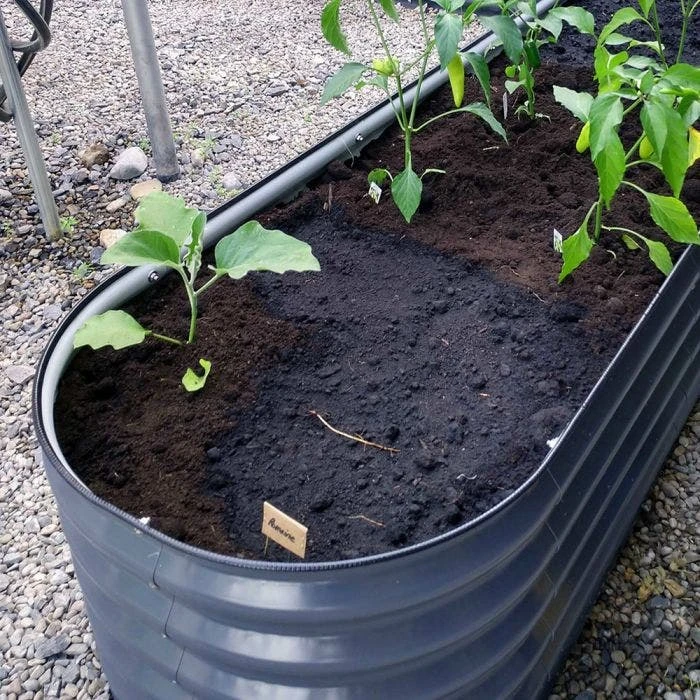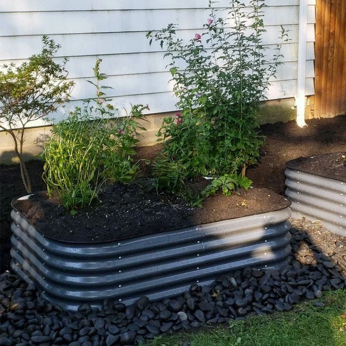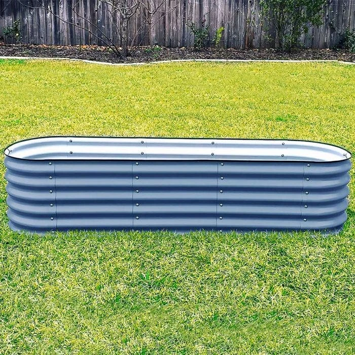 The Vego Garden 6-in-1 Modular Raised Garden Bed creates a bed that stands 17-inches tall and is optimal for root health. Build up to six different configurations with this compact, modular kit, allowing you to build versatile configurations to fit any space. Long lasting Aluzinc coated metal last up to seven times longer than regular standard galvanized beds. Aluzinc steel will slowly add essential elements of aluminum, zinc and iron are slowly added to the soil. Painted with a highly durable, specialized paint blended for the farming industry that is food -grade and USDA certified. The oval design does not have any sharp corners with a heavy duty rubber safety strip for superior protection from cuts and scrapes when gardening. Each bed comes with a 10 year limited warranty and is available in white, grey, or olive green.