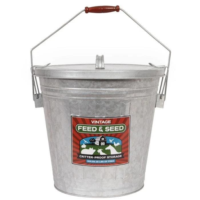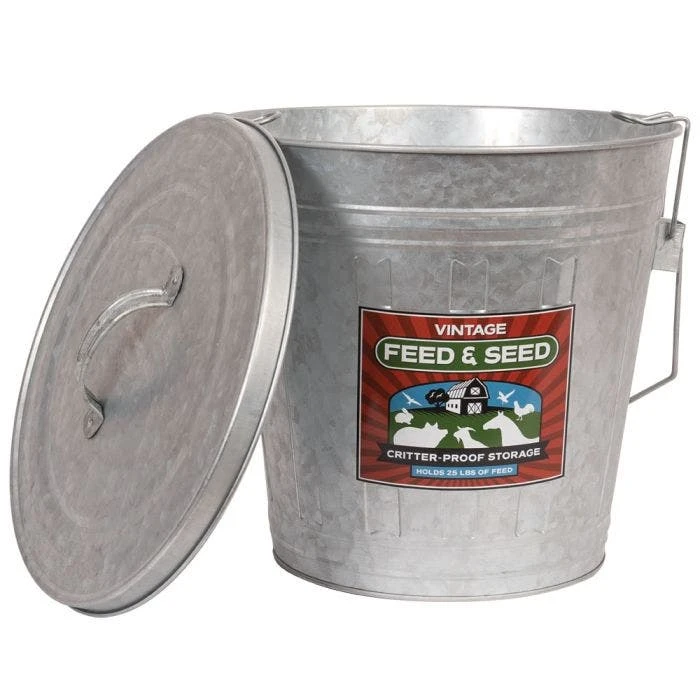 Keep unwanted critters out of your bird„s feed. This vintage galvanized metal storage bin with locking lid stores up to 25 lbs of feed or seeds all while keeping out unwanted critters from feasting on your birds feed. A built-in handle allows for easy moving to and from the feeder and a colorful label reminds you of what is being stored inside. Can also be used as a unique planter.